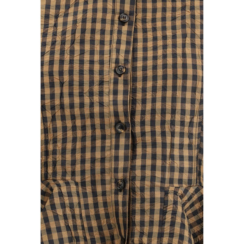 The Blouse in crinkled checked taffeta plays with volume through a graphic, modern elegance. A classic collar and button-front closure keep the line clean, while the silhouette opens into a refined peplum effect: the lower section flares like a sculpted mini skirt, with soft, tiered folds that add movement and subtly define the waist.