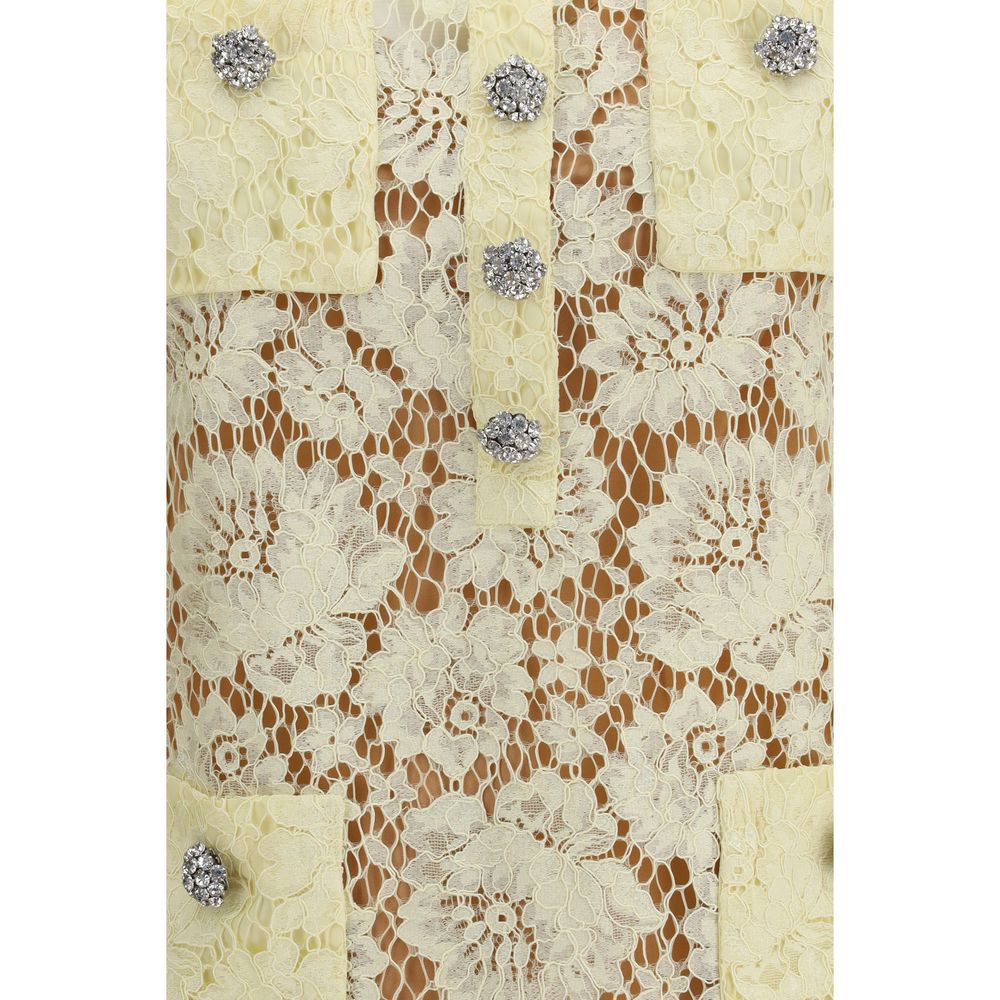 The fine lace mini Dress by Self Portrait blends romantic charm with playful elegance. Crafted from buttery yellow floral lace, it features a fitted silhouette that flatters the figure with ease. Sparkling diamanté trims add refined shine, while the scalloped hem enhances the feminine appeal. Finished with a concealed zip closure at the back and a removable cami lining, it is a versatile piece perfect for garden parties or wedding occasions.