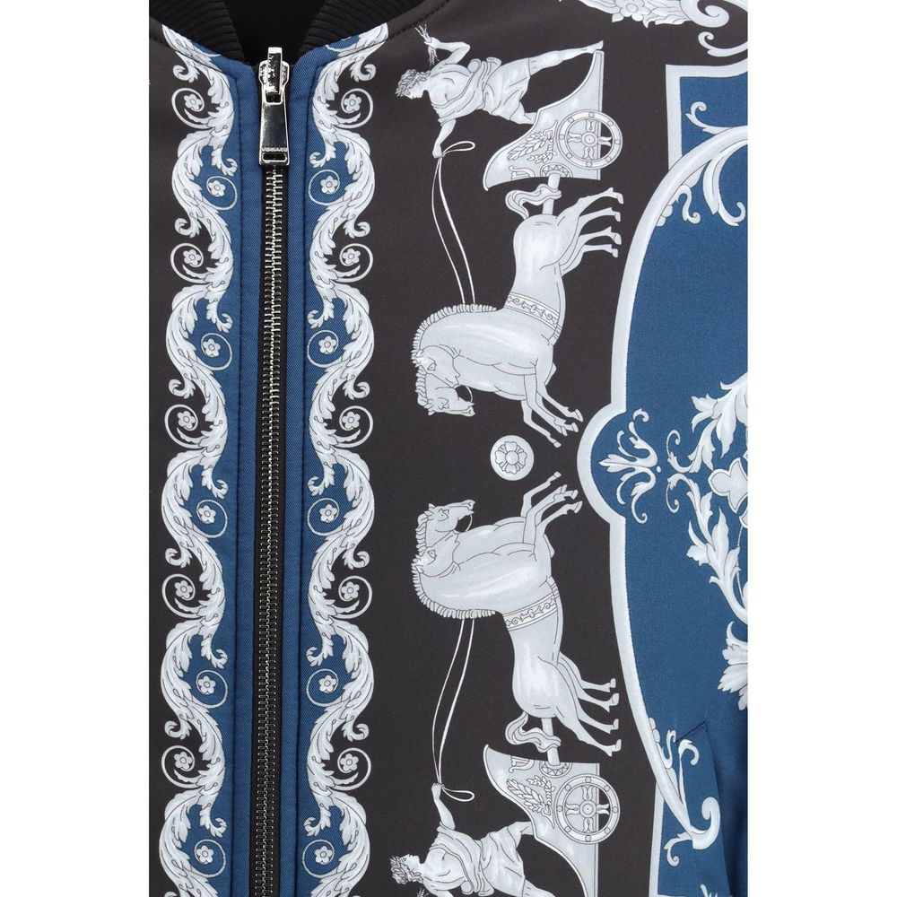 The reversible Blouson by Versace is a versatile piece with a bold presence. It features two front pockets with single-button closures arranged diagonally, and an embroidered logo positioned on the left chest for a signature touch. The jacket closes with a full front zipper, while ribbed cuffs and hem provide structure and a refined finish. A design crafted for dynamic, contemporary elegance.